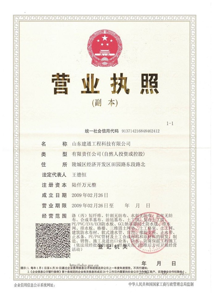 山東建通工程科技有限公司是以新型復合土工材料的生產制造為主,集防滲咨詢、技術咨詢、施工服務于一體的土工材料工程公司。公司注冊資本6000萬元,是我國目前規模較大的土工材料生產廠家之一。位于山東德州陵縣,地理位置優越,交通運輸十分便捷。
